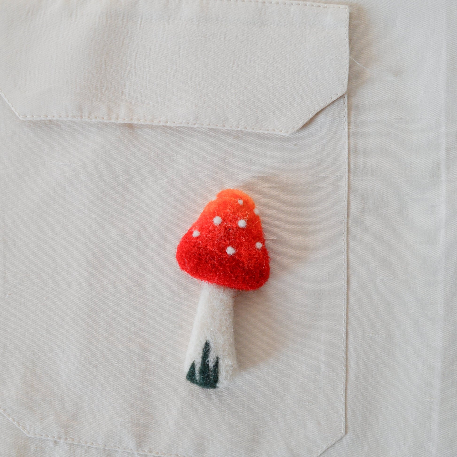 Spilla fungo realizzata a mano con la tecnica del feltro ad ago.